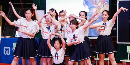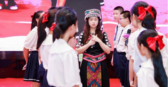 活动中,团队成员教师叶悦进行《长发妹》英语教育戏剧课例展示,该课例根据广西侗族民间故事改编,融入侗族大歌、竹竿舞、侗族服饰等多种民族元素,通过运用教育戏剧游戏及“墙上的角色”“静态画面”“良心巷”“声音剧场”等多种范式进行全英教学,给现场观众展示了在民族地区日常教育教学中怎样寓教于乐的同时融入民族元素。